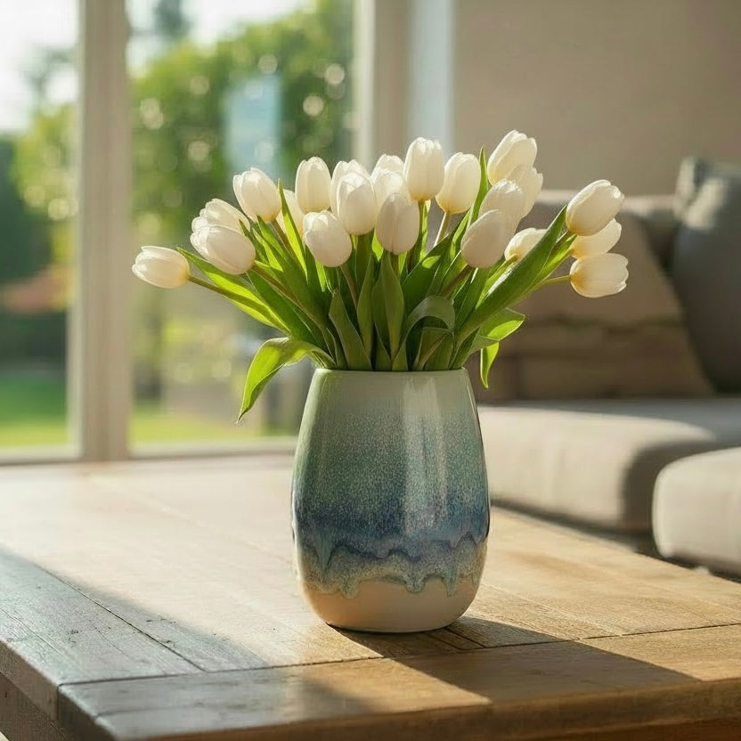 Die weichen Farbverläufe und die organische Form machen jede Vase zu einem Unikat. Sie eignet sich perfekt für frische Blumen, Trockenblumen oder einfach als dekoratives Einzelstück, das Ruhe und Gelassenheit ausstrahlt.
