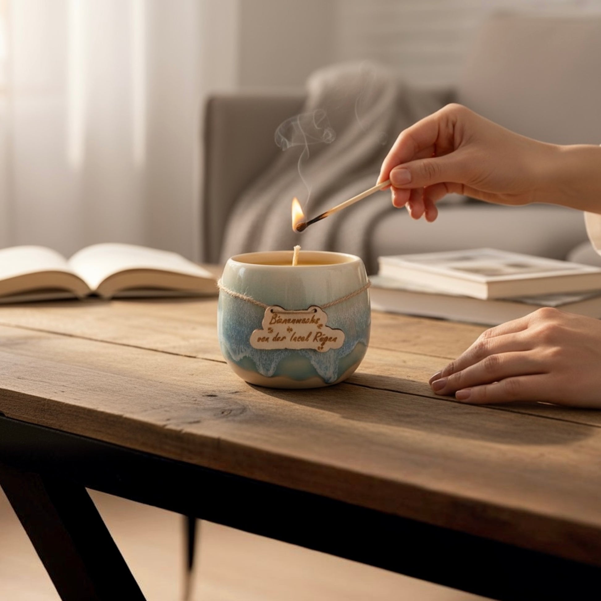 Mit der 300 ml reinen Bienenwachskerze 🐝 im Keramikbecher bringst du das Meer und den Duft der Insel, eingefangen von den Bienen auf Rügen, in dein Zuhause 🏡