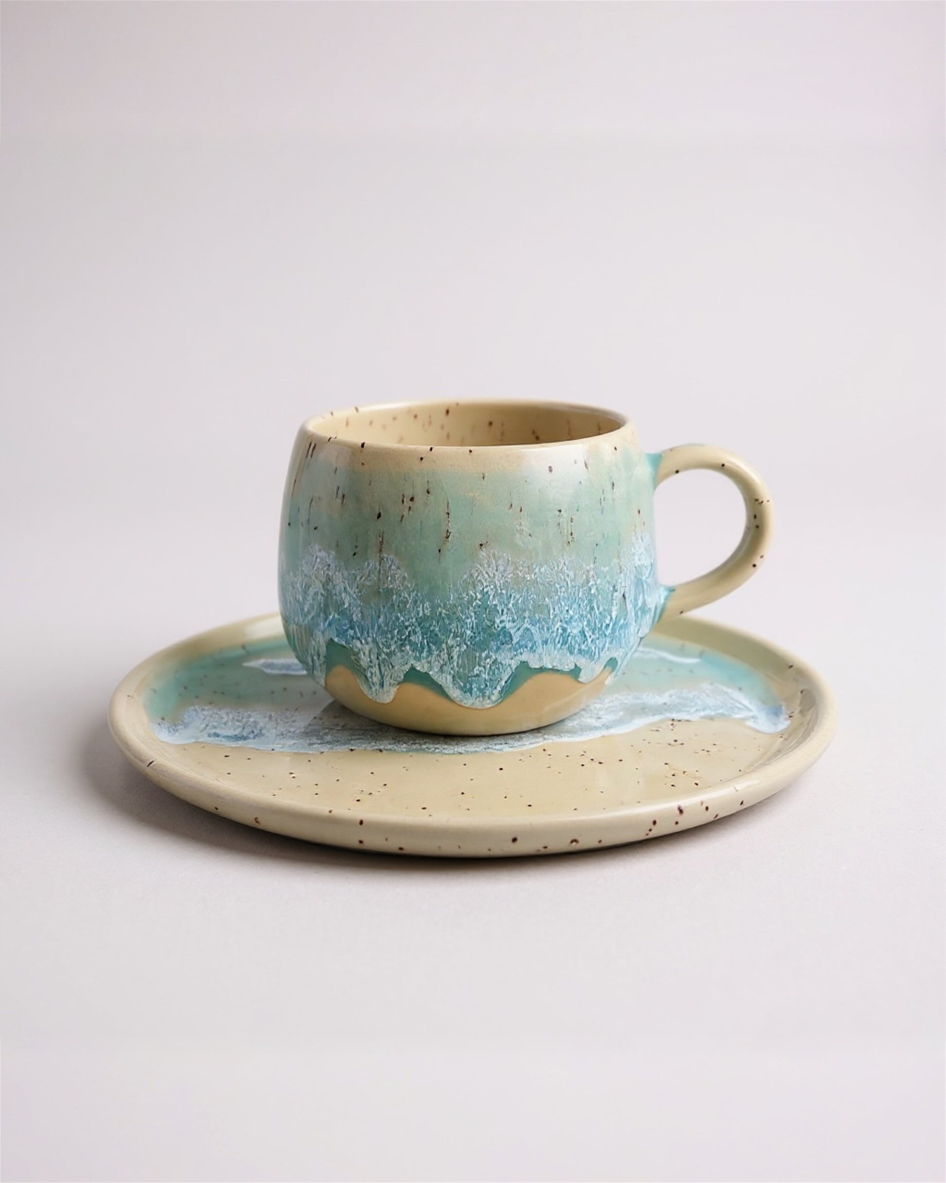Die Tasse mit einem Fassungsvermögen von ca. 300 ml schmiegt sich weich in die Hand – rund, organisch und angenehm griffig, als hielte man ein kleines Stück Natur fest. Der Teller mit etwa 20 cm Durchmesser erweitert dieses Gefühl: Er wirkt wie eine kleine Küstenlandschaft, ideal als Unterteller, für Kuchen, Snacks oder das besondere Frühstücksmoment.