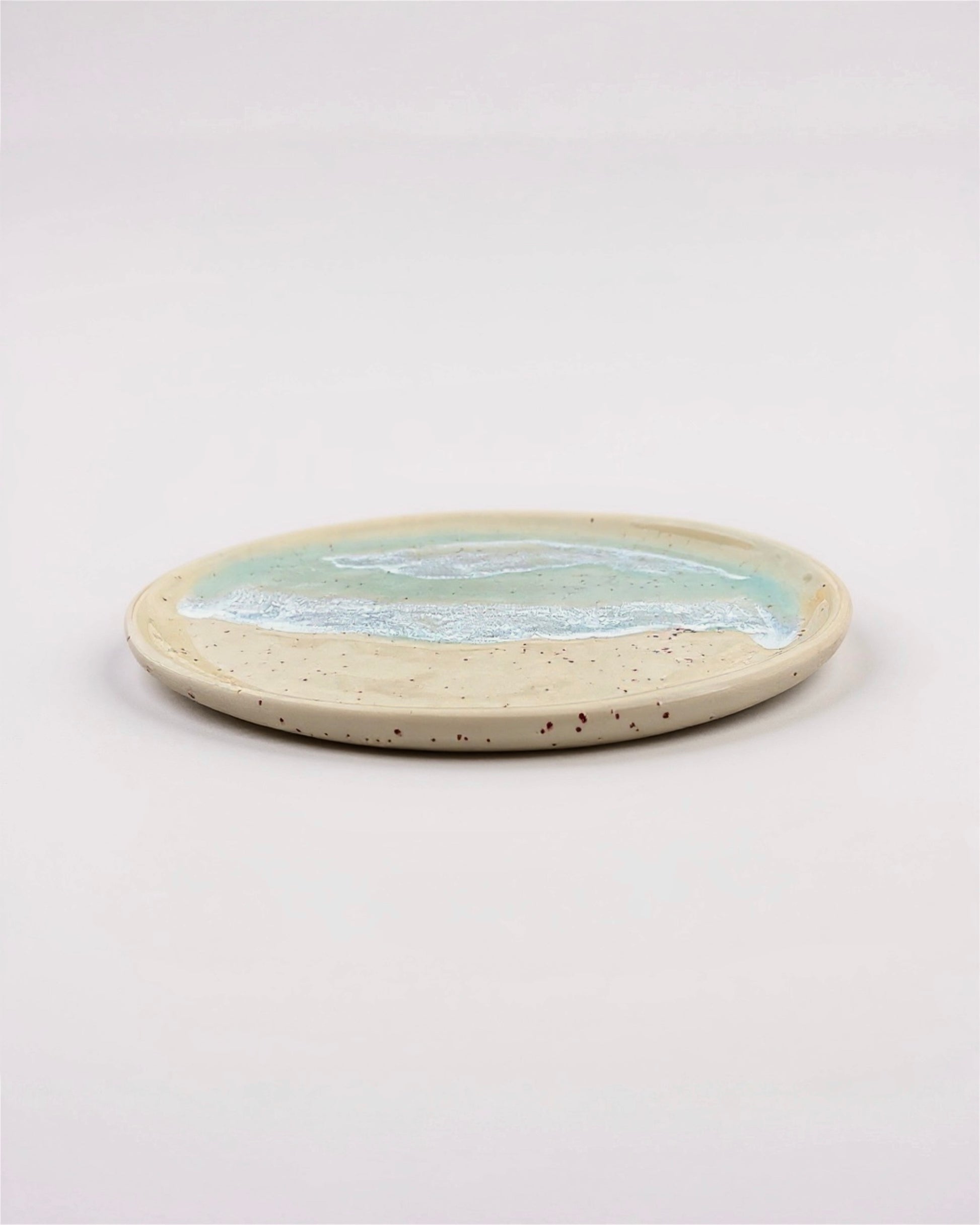 Auf diesem handgefertigten Keramikteller scheinen sich Strand und Welle zu berühren. Das sanft gesprenkelte Sandbeige erinnert an warme Küstenlinien, während ein fließender Blau-Weiß-Schimmer wie eine leise, auslaufende Welle über den Rand gleitet. Jeder Teller trägt seine eigene kleine Geschichte – in Handarbeit gefertigt, geprägt von natürlichen Farben und lebendigen Glasuren.